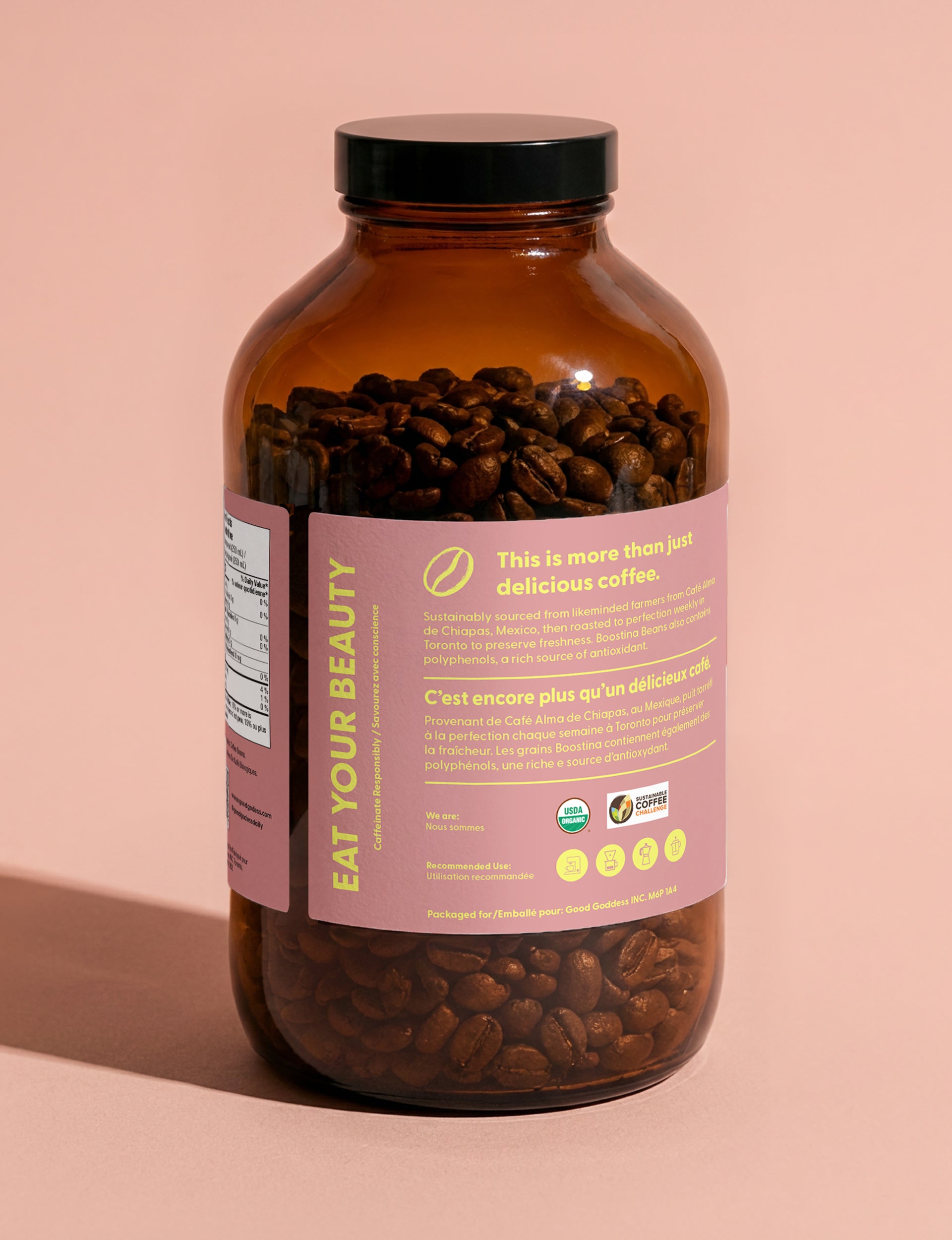 Offered in one pound bags and whole beans roasted weekly in Toronto to preserve freshness.